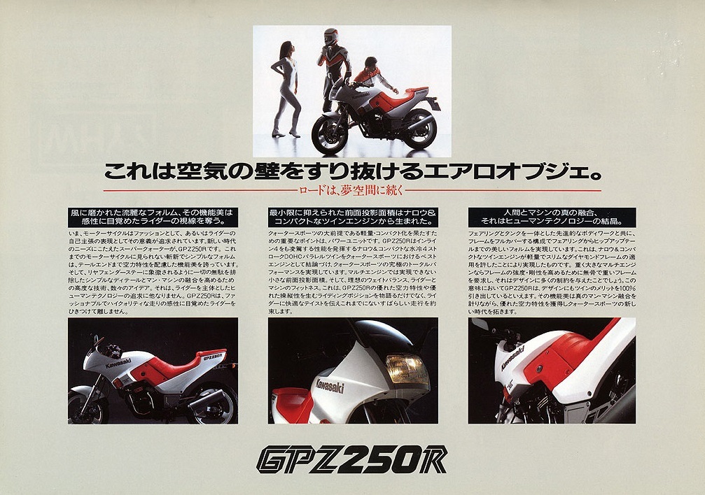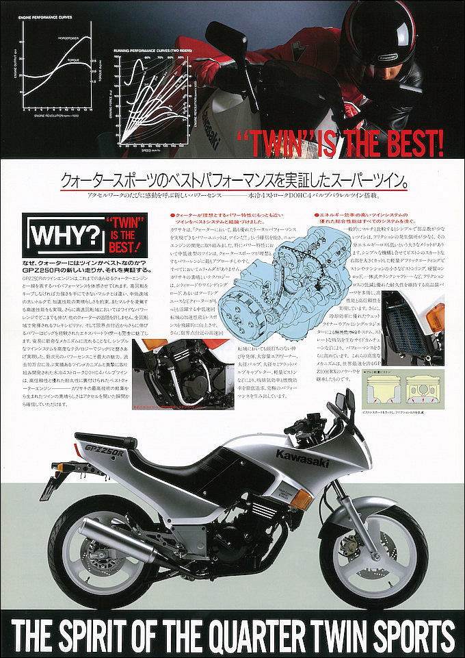 ちなみにこの水冷エンジンは、その後「GPX250R」「ZZR250」「Ninja250R」らへと引き継がれる超 ロングセラーエンジンとなる